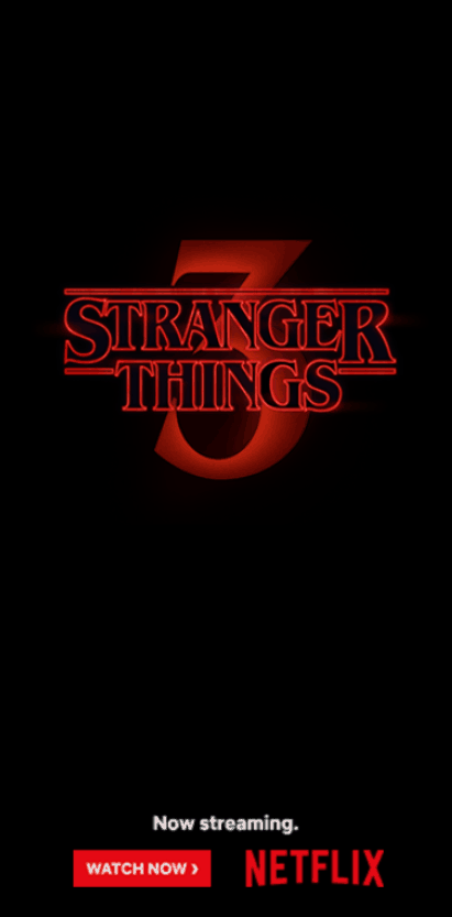 A fade-in pop-up logo of the new Netflix series on a dark background encourages fans to watch it right now.