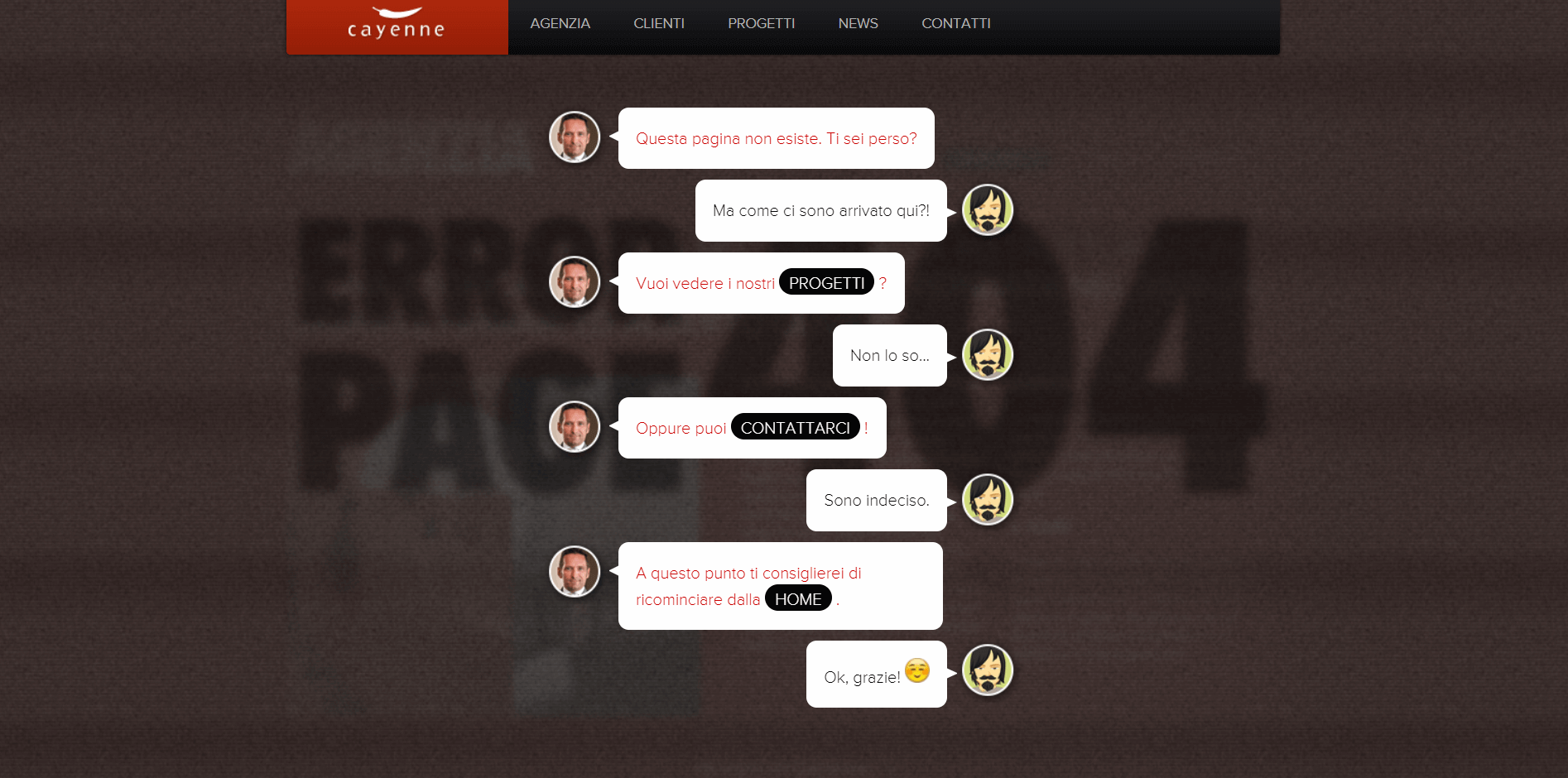 Cayenne, an Italian design studio, has come up with an interesting version of a 404 page. It’s created as a dialog between a user and a moderator. The moderator offers some solutions to the user’s issue.