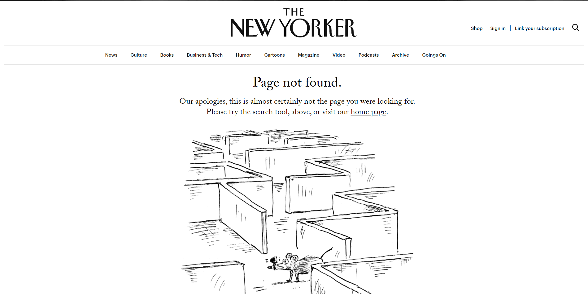 The New Yorker is a famous American weekly magazine published since 1925. Its 404 page is designed in a corporate style and has the convenient navigation.
