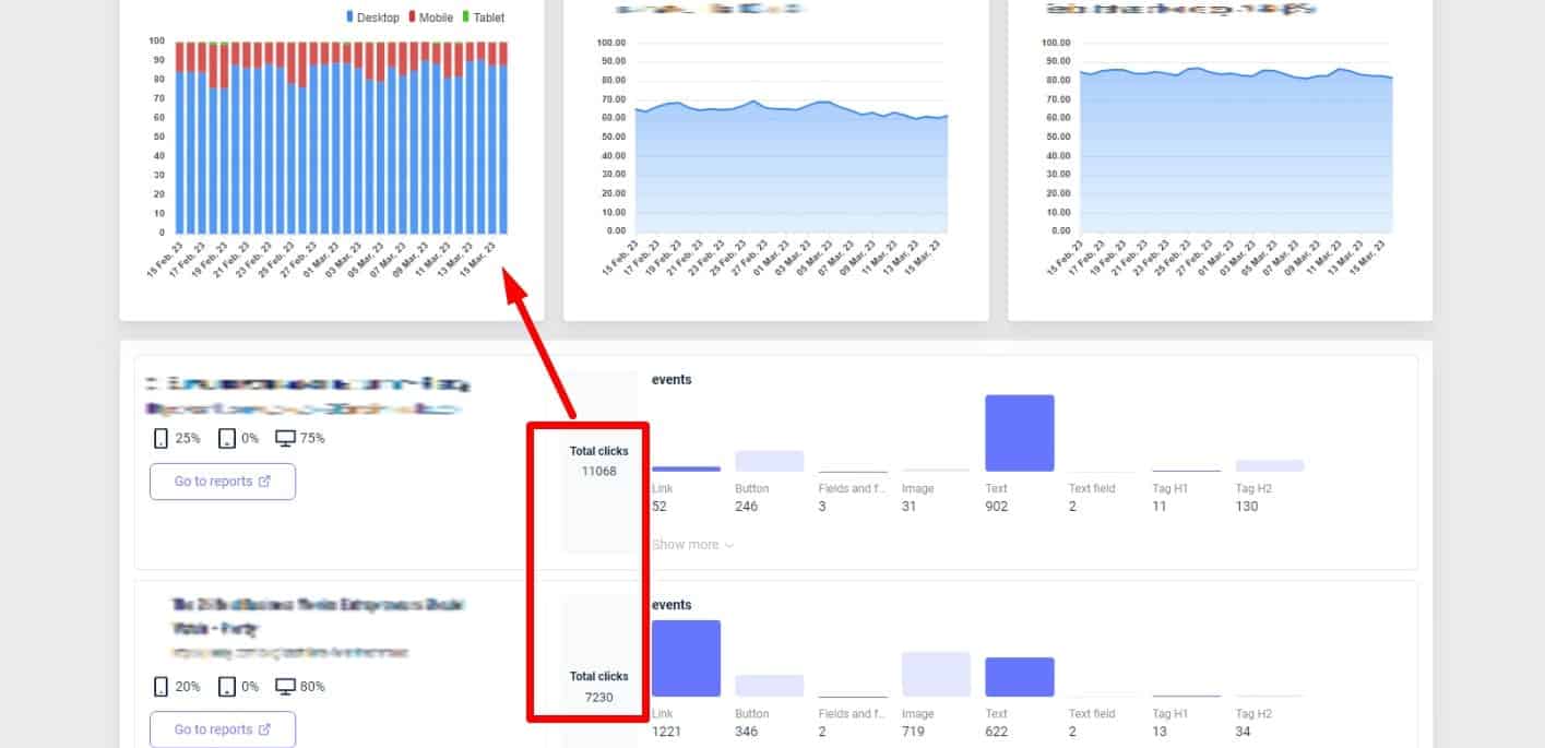 The data split by device type reveals the ratio between several segments and the click count on page elements: