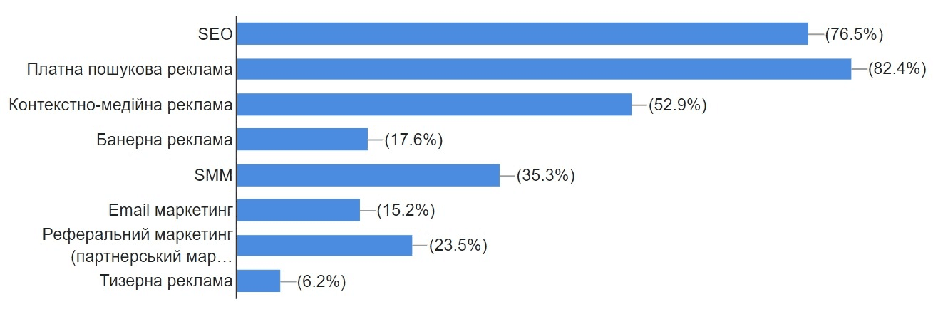 Для создания максимально объективной статистики были отобраны магазины из разных областей онлайн-продаж и поставлены многосторонние вопросы с целью охвата всех каналов интернет-маркетинга, а именно: SEO, платной поисковой рекламы (Google Ads), контекстно-медийной рекламы, баннерной рекламы , SMM, Email-маркетинга, реферального маркетинга (партнерского маркетинга), тизерной рекламы.